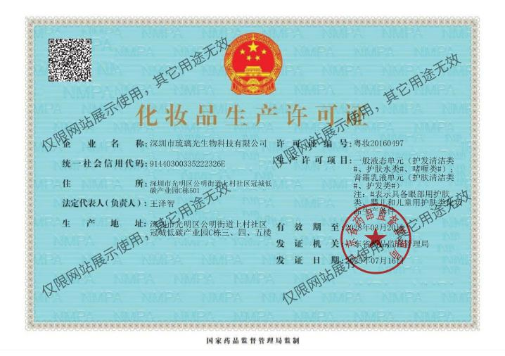 為進一步規范企業經營資質,保障產品生產合規性,深圳市琉璃光生物科技有限公司化妝品生產許可證于2025年7月16日成功完成更新手續,目前為持續有效狀態化妝品生產許可證編號:粵妝20160497。